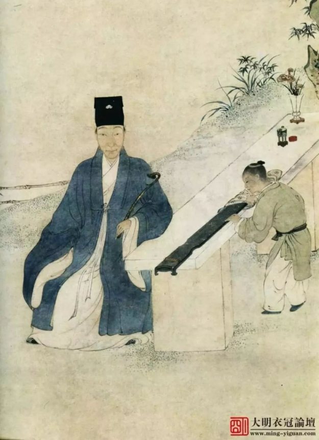从上面这张图就可以明确看到主仆关系,左边是士大夫阶级,穿宽袍大袖,右边是仆从,穿窄袖衣。
