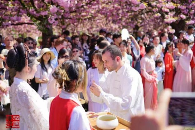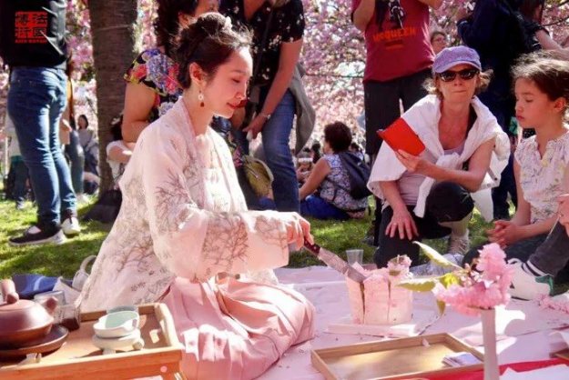 落樱、微风、阳光,一年一度的流樱茶宴环节到了,有如兰亭集序的曲水流觞集,身着汉服的成员们在如云似雾的花树下盛装入座。这一幕长达二十五米的流樱茶席,与漫天自然挥落的花瓣相呼应,浪漫皆在心。大批摄影者驻足拍摄。