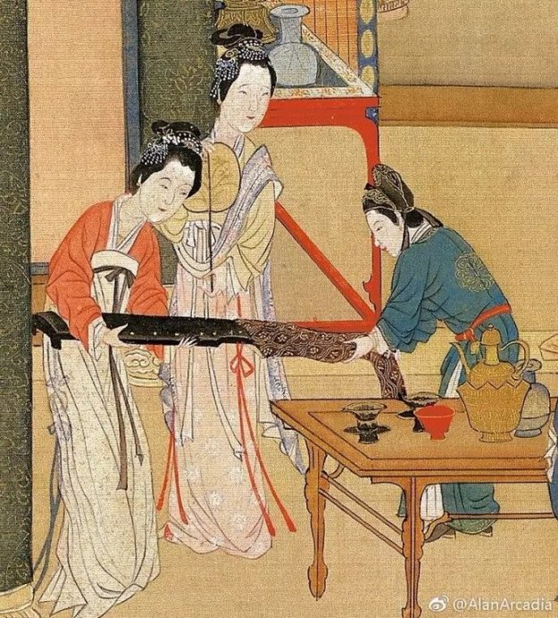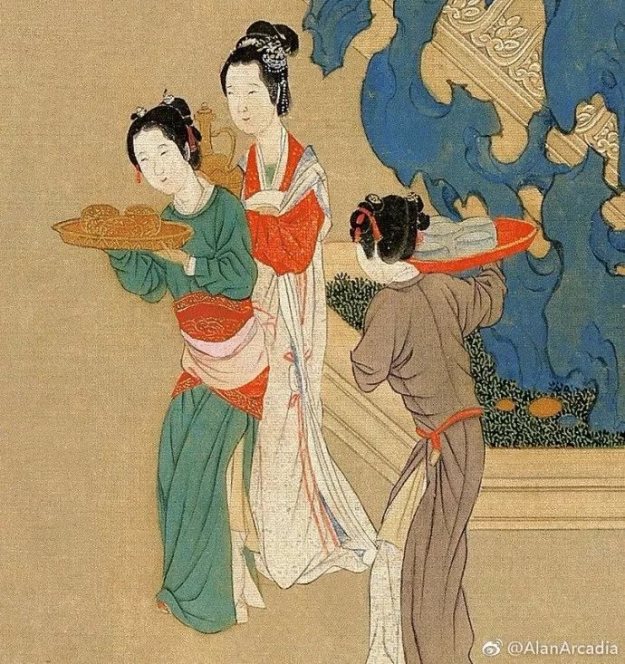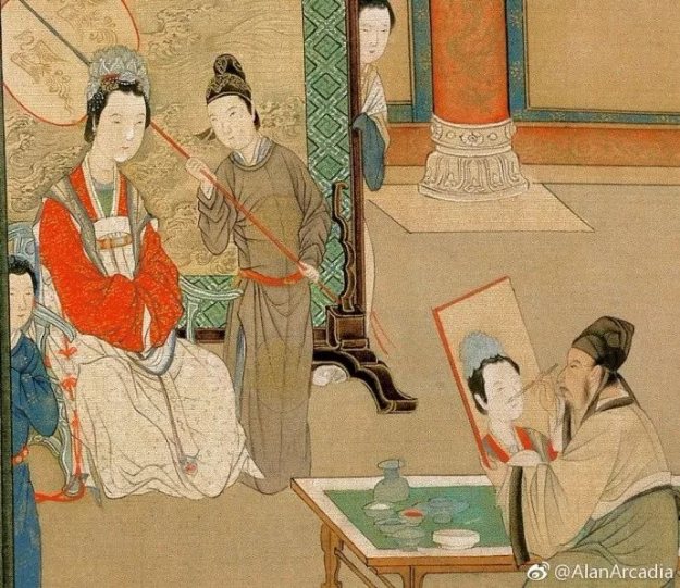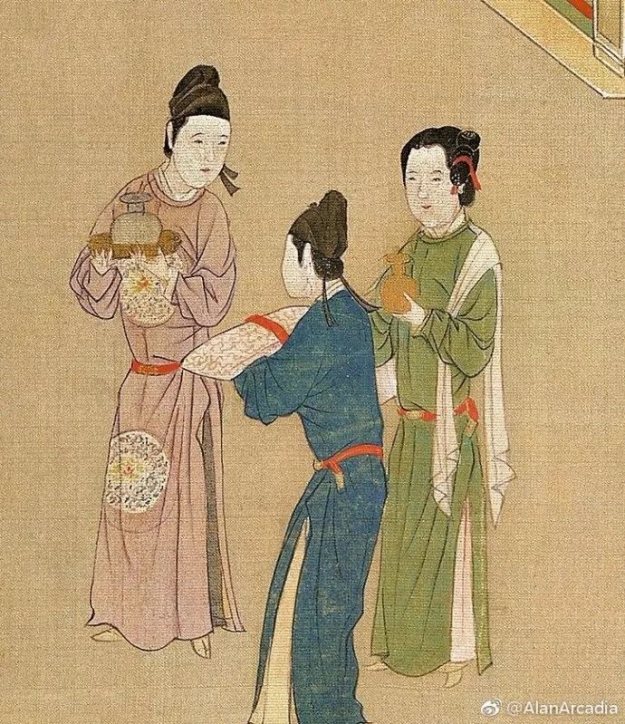 深衣有曲裾与直裾之分,裾为衣服的大襟。直裾,就是衣襟从身子的侧面垂直而下。曲裾,则是把衣襟接长为三角形,绕到身后,然后用丝带系扎。直裾其实很像当时的内衣袍,而东汉后,它们也确实合二为一,变成既可内穿也能外穿的“袍”。隋唐时期,承袭深衣形制的袍,遇到了喜欢胡风的皇帝。于是胡人的圆领与汉族的长袍(交领)被合为一体,变为圆领长袍,而且还成了官服。