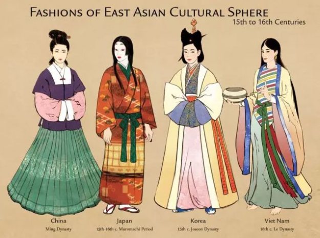 至明朝时期,汉民族服饰已深刻地影响了周边国家(下图:15至16世纪同时期朝鲜、日本、越南等国服饰)。亚洲各国如日本、朝鲜、越南、蒙古、不丹等等服饰均具有或借鉴汉服特征。日本的和服和韩国的韩服,都是以汉服为基础转变而来的。