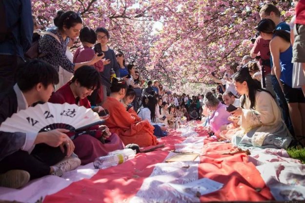 4月20日,两千余名中法友人和中国文化爱好者齐聚巴黎南郊苏镇公园(Parc de Sceaux)的粉色樱花园,共庆一年一度的“樱花上巳节”。今年是法国博衍协会连续第5届举办上巳节庆祝活动。协会会员与汉服爱好者们皆换上了汉族传统服饰,在樱花园内展现中华民族“返璞归真、天人合一”的民俗之美。