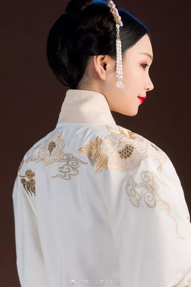 汉服之美,领口左右相交,象征地道方正。交领的右衽覆盖于左衽之上,也体现了右衽为阳在外,左衽为阴在内的阴阳观念,显出独特的中正气韵,代表做人要不偏不倚。