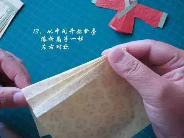 12、先将纸对折,再沿着中间的折痕分别平行折出0.5厘米宽度,两边加起来就是1厘米,组成下裙中间的蔽膝。再沿两边这条线往外折,像折扇子,每折的一片都要露出来....还是见图吧...