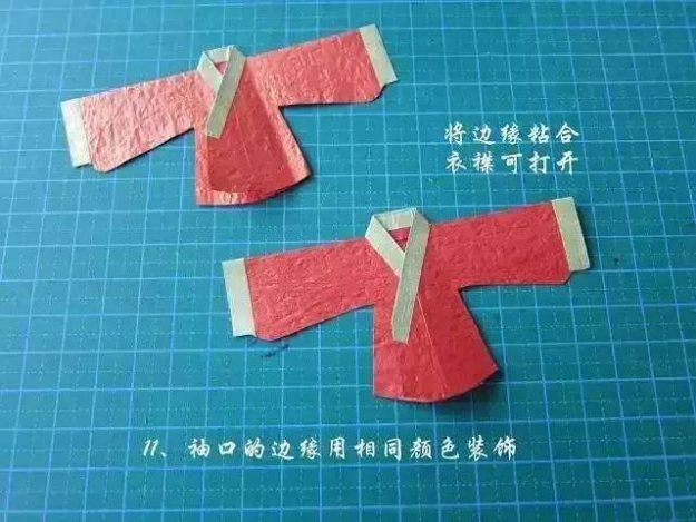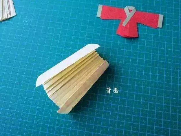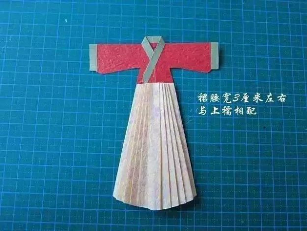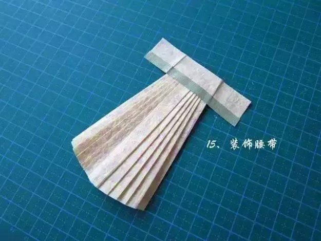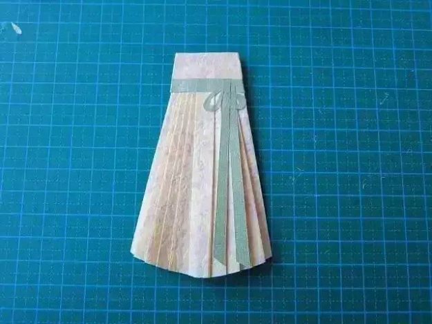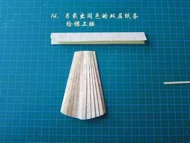 14、再给下裙做腰,也是双层纸可以包住下裙,黏好腰,再裁一条比较窄的其他颜色纸条作为系带黏在腰下(如图)