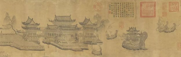 《龙池竞渡图》 ( 局部),元,王振鹏,白描界画,绢本,纵30.2厘米,横243.8厘米,现藏台北故宫博物院,绘宋徽宗崇宁年间(1102—1106年)三月三日开放金明池,龙舟竞渡一事。图中御座大龙舟在四艘龙头、虎头船的前后摇旗护送下,昂首向前。早在屈原自溺之前两百余年的吴越两国,已有了龙舟竞渡,民间竞渡的时间,不限于端午节,划龙舟也不全都是为了纪念屈原
