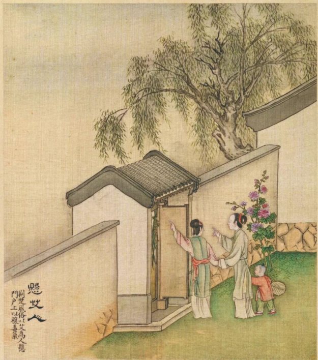 《端阳故事图》 册之悬艾人,清乾隆,徐扬,绢本设色,纵20.7 厘米,横18.2 厘米,现藏故宫博物院。端午节最初是带有驱毒辟邪意义的节日,民间有将艾草扎成人形挂在大门的习俗,认为可禳除毒气
