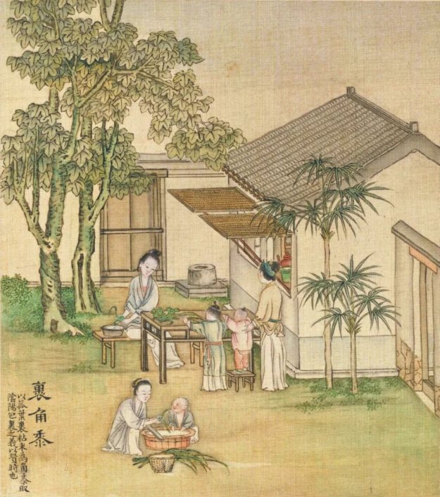 《端阳故事图》册之裹角黍,清乾隆,徐扬,绢本设色,纵20.7厘米,横18.2厘米,现藏故宫博物院。
