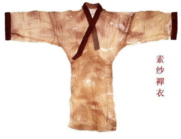 马王堆一号汉墓出土的素纱襌(单)衣,衣长128厘米,通袖长190厘米,由上衣和下裳两部分构成。交领、右衽(rèn)、直裾。面料为素纱,缘为几何纹绒圈锦。