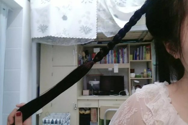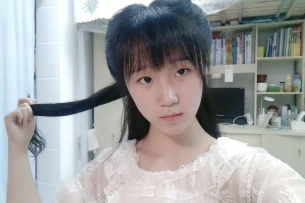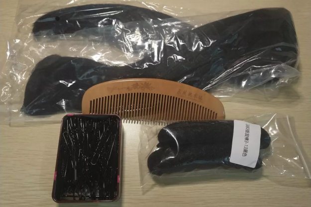 而后将假发片拿出,夹在中间的小揪上,固定好即可。