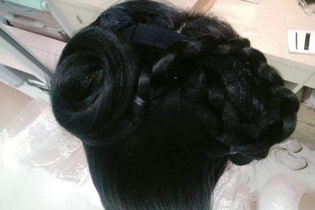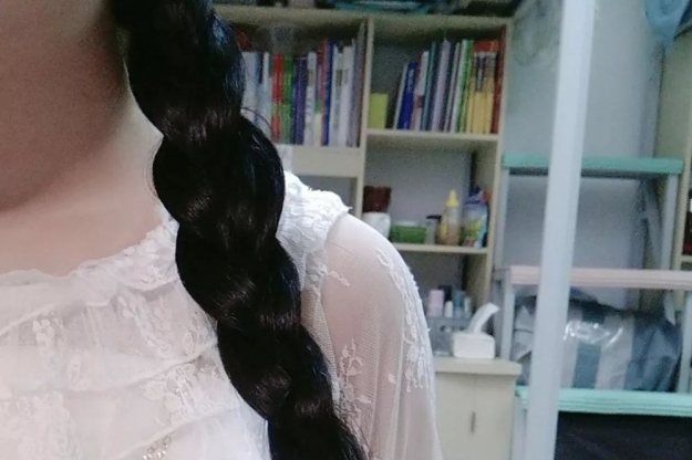 接下来,将假发片分为两半,将其中一半编成麻花辫。