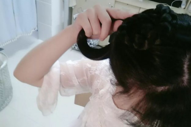 接下来将剩下的头发再绕一个圈,尽量固定在靠后一点的位置,会显得更好看哦。