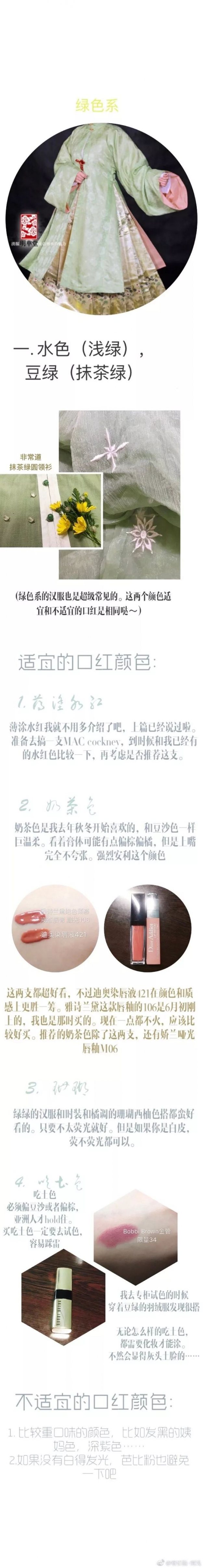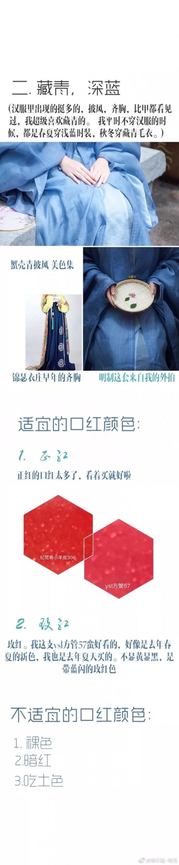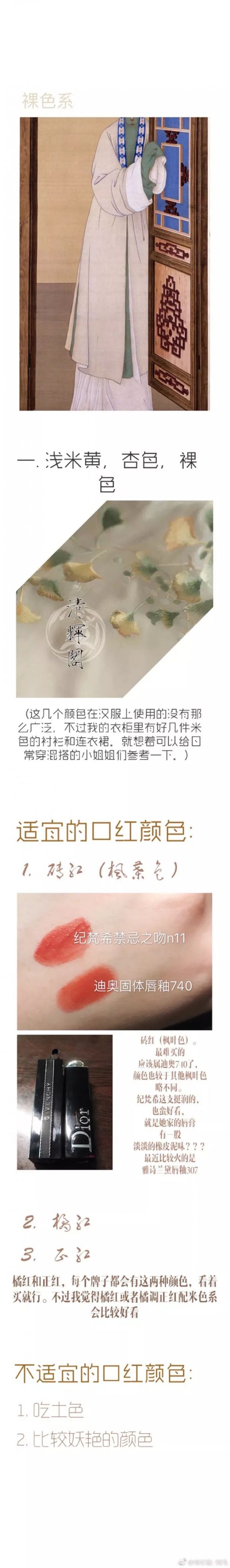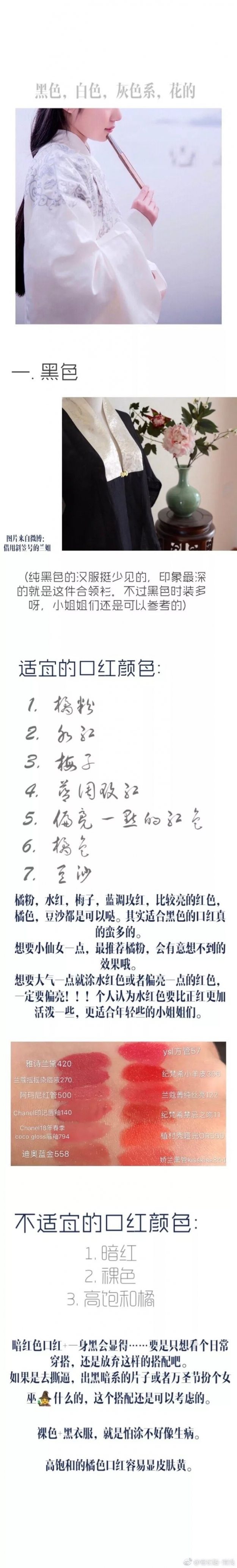 虽然妆容没多大差别,但是选择合适自己肤色、汉服颜色的口红才是最紧要的,并且能让你所散发的气质有所不同。今天小编从微薄找来一篇汉服颜色与口红颜色搭配的干货,由@雪初融-清浅 所写,并分享给大家。这位小姐姐可是很努力的制作长图,并分成了上、中、下三篇,实在是很厉害~为小姐姐鼓掌!小编怕大家太着急,就一次性发完了哈哈哈~