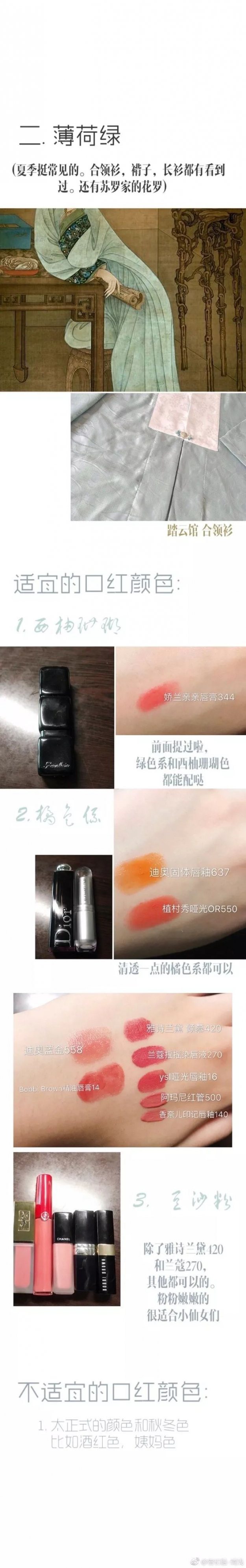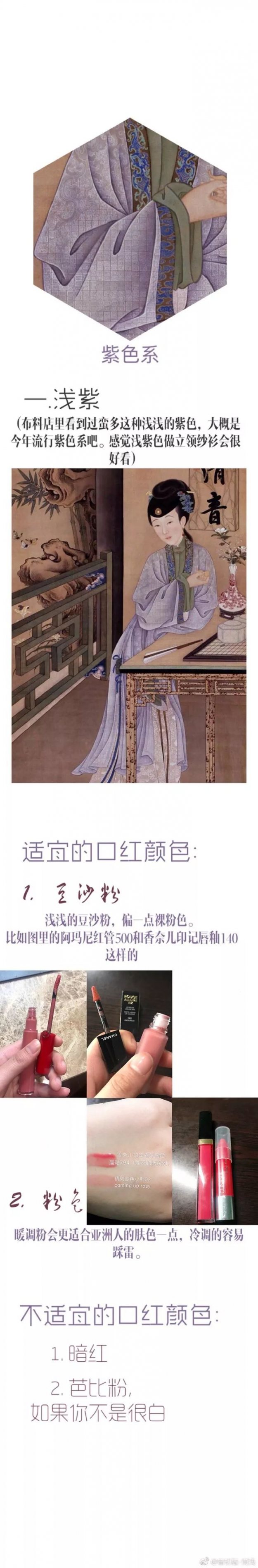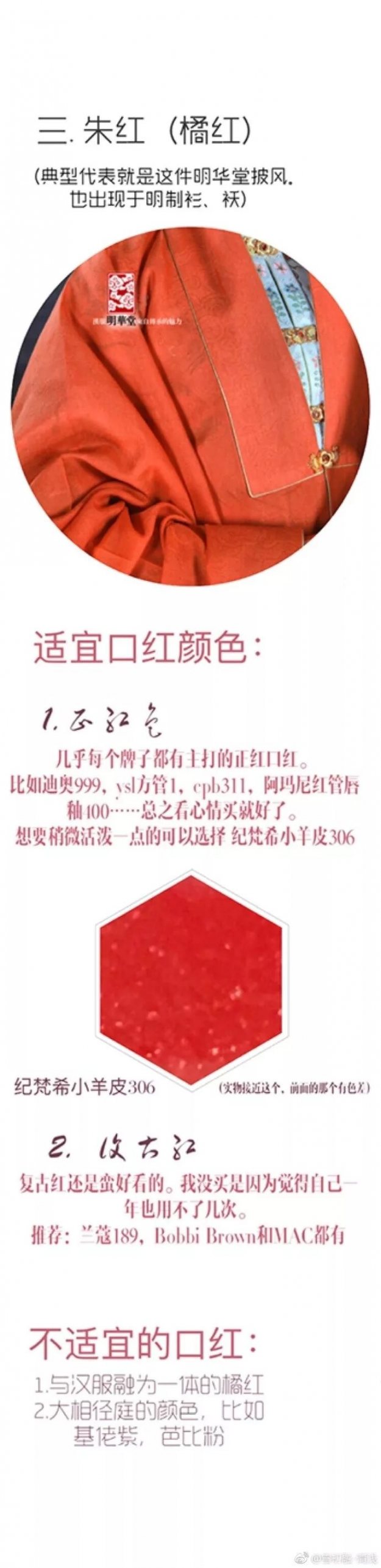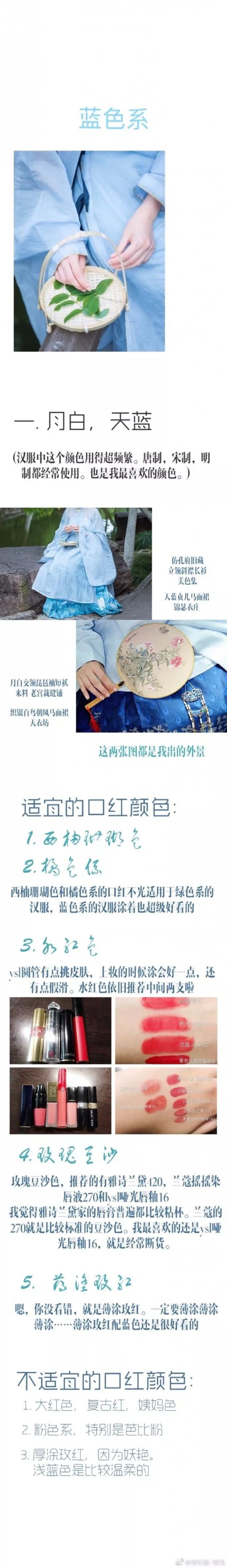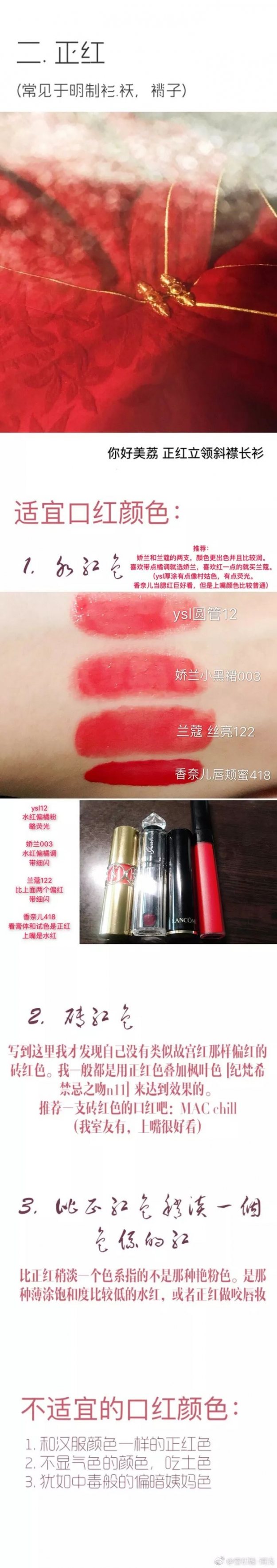 虽然妆容没多大差别,但是选择合适自己肤色、汉服颜色的口红才是最紧要的,并且能让你所散发的气质有所不同。今天小编从微薄找来一篇汉服颜色与口红颜色搭配的干货,由@雪初融-清浅 所写,并分享给大家。这位小姐姐可是很努力的制作长图,并分成了上、中、下三篇,实在是很厉害~为小姐姐鼓掌!小编怕大家太着急,就一次性发完了哈哈哈~