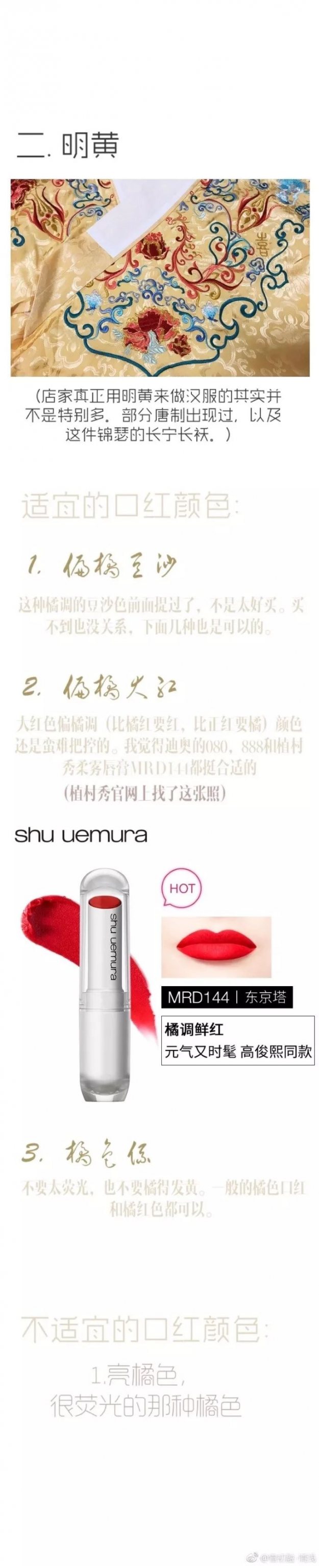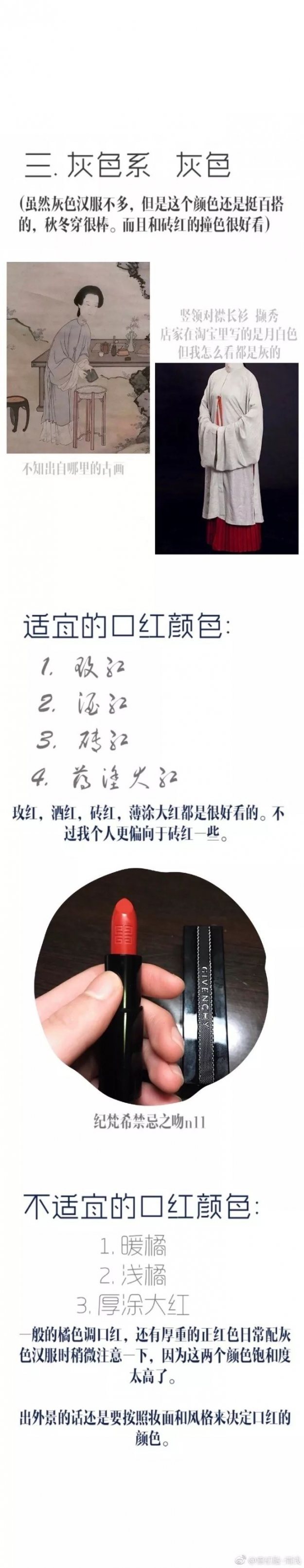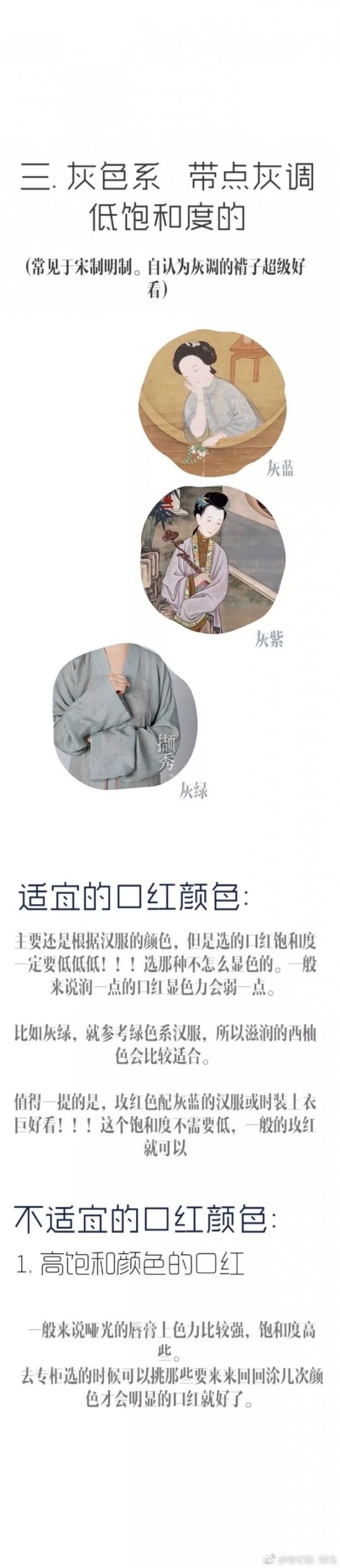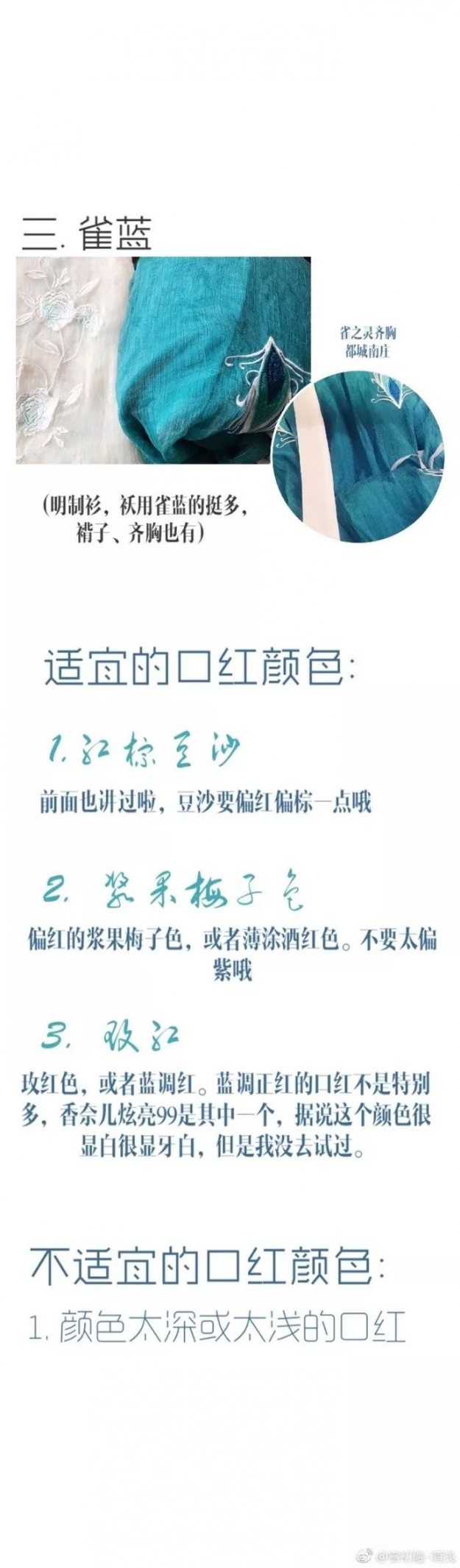 虽然妆容没多大差别,但是选择合适自己肤色、汉服颜色的口红才是最紧要的,并且能让你所散发的气质有所不同。今天小编从微薄找来一篇汉服颜色与口红颜色搭配的干货,由@雪初融-清浅 所写,并分享给大家。这位小姐姐可是很努力的制作长图,并分成了上、中、下三篇,实在是很厉害~为小姐姐鼓掌!小编怕大家太着急,就一次性发完了哈哈哈~