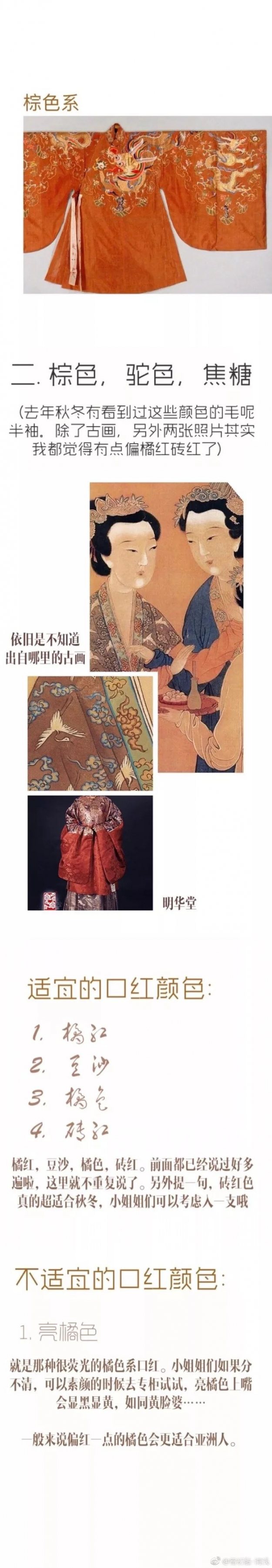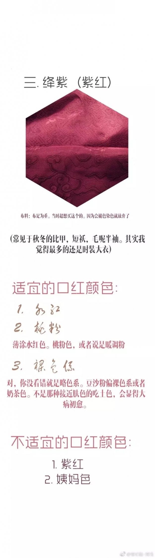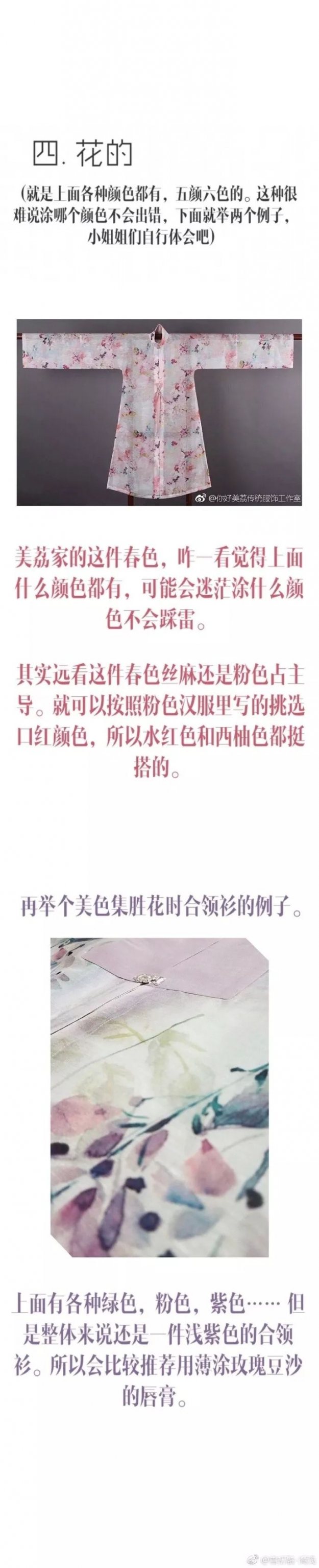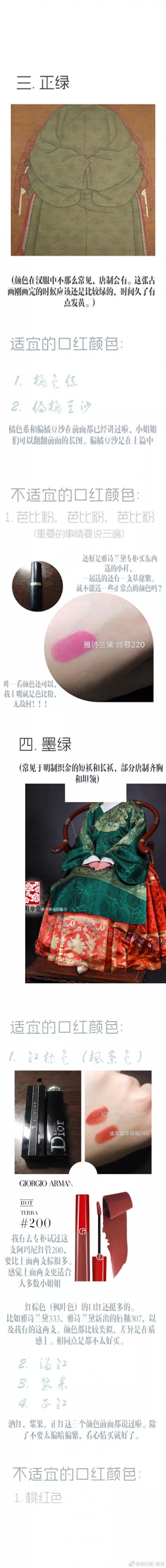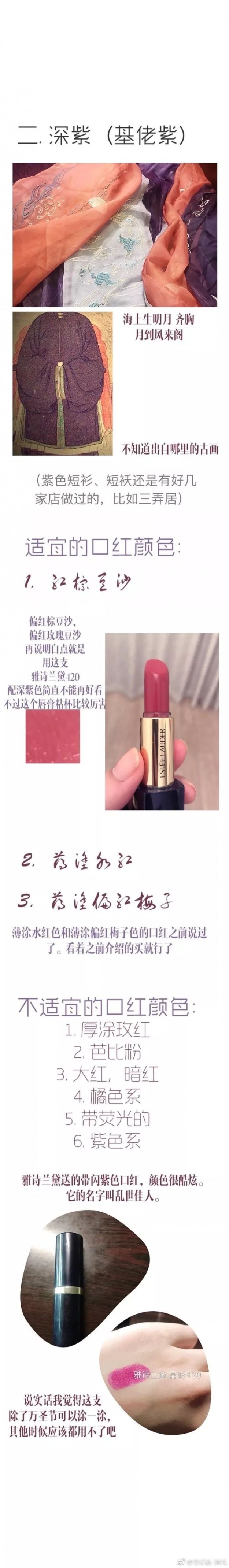 虽然妆容没多大差别,但是选择合适自己肤色、汉服颜色的口红才是最紧要的,并且能让你所散发的气质有所不同。今天小编从微薄找来一篇汉服颜色与口红颜色搭配的干货,由@雪初融-清浅 所写,并分享给大家。这位小姐姐可是很努力的制作长图,并分成了上、中、下三篇,实在是很厉害~为小姐姐鼓掌!小编怕大家太着急,就一次性发完了哈哈哈~