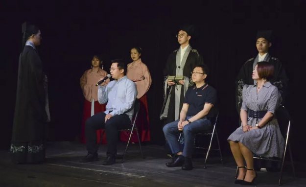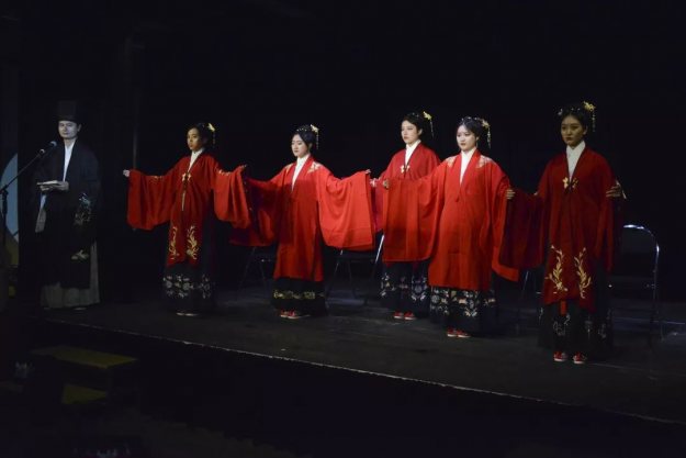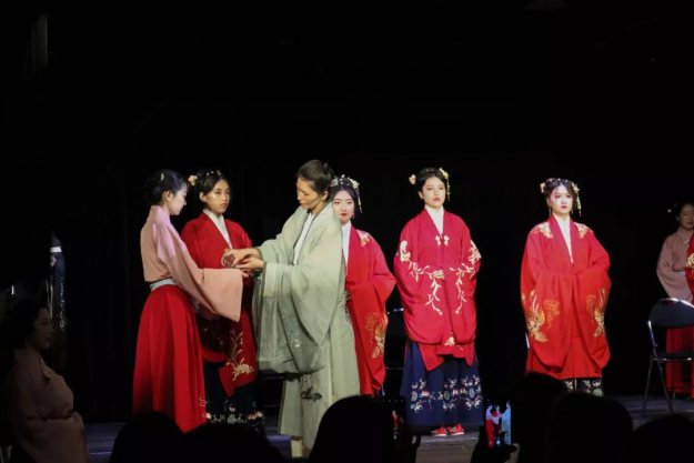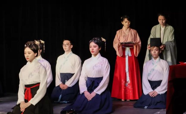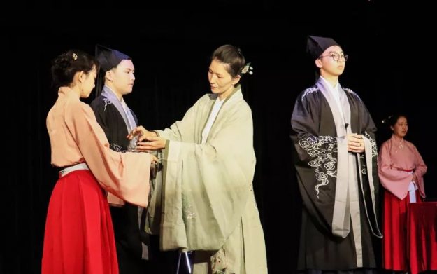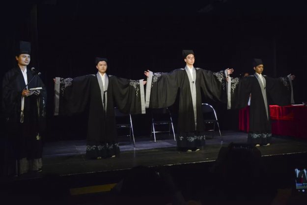 本次笄礼冠礼采用的一加形式。男生女生们身着基本的上衣下裳制服饰,正坐于舞台中央。老师郑重地为他们戴上笄(簪子)与冠。