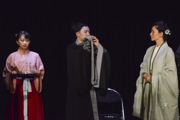 后面的环节按性别分组进行。首先是冠者登场。他们穿起玄色的大袖衫,并展示给在场来宾。