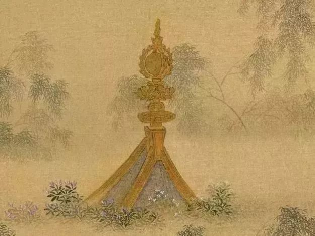 在晨雾弥漫的树丛中,若隐若现着金色殿宇顶,随风飘动的黄旗,这是整幅图卷的前奏。