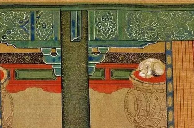 这一处宫苑,描绘了一群仕女舞蹈、奏乐等活动,乐器有琵琶、古琴、古筝、笛子等与闹腾的乐舞表演相对应的,便是那只在房间睡觉的懒猫。