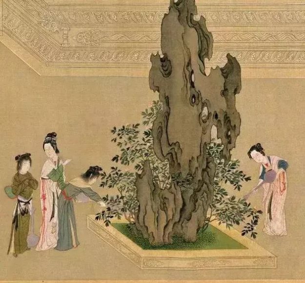 再往前走是一处较为空旷的院落,有仕女在打理花草,攀枝折桂,三三两两聚在一起谈笑有声。