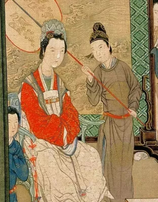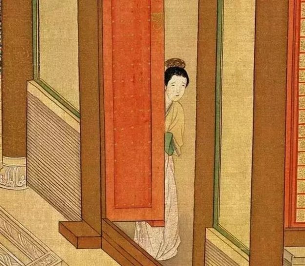 身后的宫苑中有女官在给孔雀喂食,屋内两个执扇的侍者正相背而立,一位衣着朴素的宫婢伫立在半开的门边,眼神望向远方。