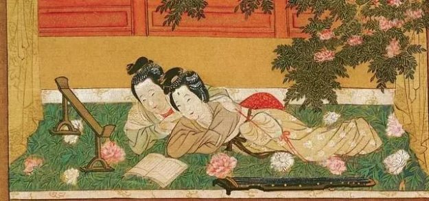 这两位小姐姐在安静地阅读,她们用手肘撑扶,斜卧阅读,完美的鹅蛋形脸庞微微侧着,她们或许代表了一种理想美的形式,眼眉清秀,嘴唇秀美,鼻子以侧面表现,用一根线画出,颇有日本浮世绘的感觉。