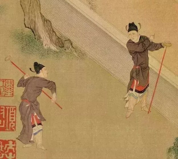 行至卷末,只两个侍卫立于宫墙之外,似乎在交接班或是交谈什么内容。全卷有开有闭,首尾呼应,意境独到。