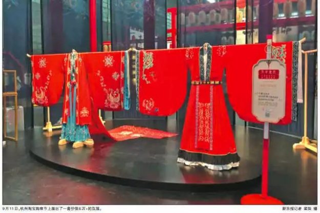 记者了解到,在汉服店铺 中,也不乏数千元、上万元、甚至 数万元的汉服,这类汉服往往以 “手工”、“限量”为卖点,结合如 “妆花”、“织锦”、“缂丝”等制作 手艺,吸引高端客户消费。