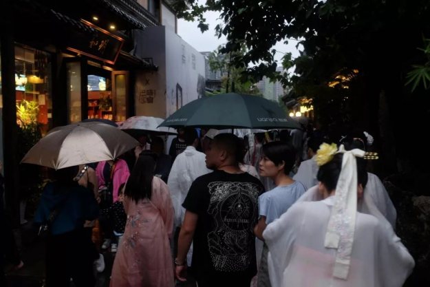 但纵使秋雨婆娑,为了给同袍和市民朋友们一个完整而不留遗憾的中秋节,为了给大家复原一个传统的中秋拜月大典,我们依旧决定活动如期举行。13号(中秋当天)一大早,在古色古香的宽窄巷子,四川汉服的小伙伴们就开始冒雨忙碌了起来,满城搬运物资,装点现场,而那时的雨,并没有要停的样子。活动群里的大家也都在报各自的位置和天气实况,一边提醒着同袍注意准备避雨措施,所有的准备都在等待雨停。