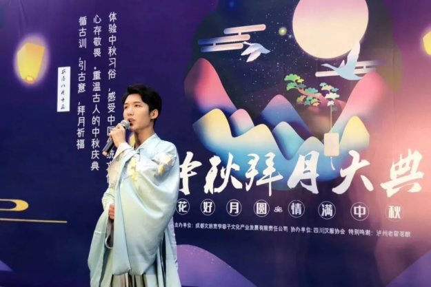 傍晚,在第一抹夜色到来的时候,宽窄巷子小洋楼广场,继一首《明月几时有》之后,庄严肃穆、意义丰富的中秋拜月大典如约举行,引来不少游客驻足围观。