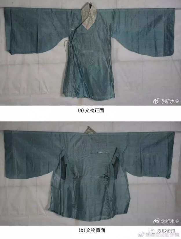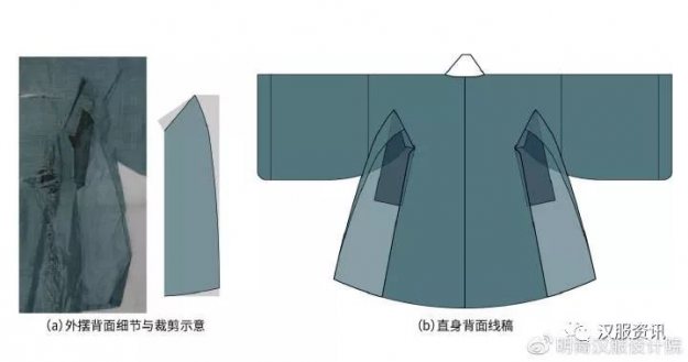 图1文物形制为直身,交领右衽,大袖收袪,实际尺寸不详[2]。大身左右各用布一幅,分别用整幅布和约1/6幅接袖两次。衣身正面腋下两侧打褶并各有一片外摆。摆身未见拼接痕迹,上端尖翘,外侧有一定弧度,背后缝有衬布。大身后片两侧无摆,直接裁出形状,较前片窄小。