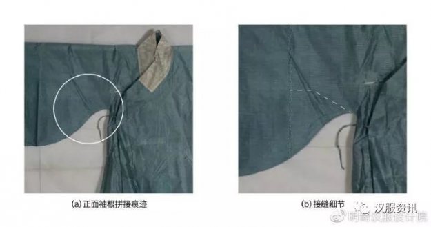 两件圆领袍也采用了“外摆占用袖身布料+拼补袖子的做法”,但袖身接缝形状与直身不同,为一段弧线,如图6。两侧外摆均接一矩形或梯形裁片,接缝同经向,外侧及上部沿外摆轮廓向后反折固定。在布幅有限的情况下,拼接的做法可以实现更为阔大的外摆,而竖缝的存在能使摆身更加硬挺。