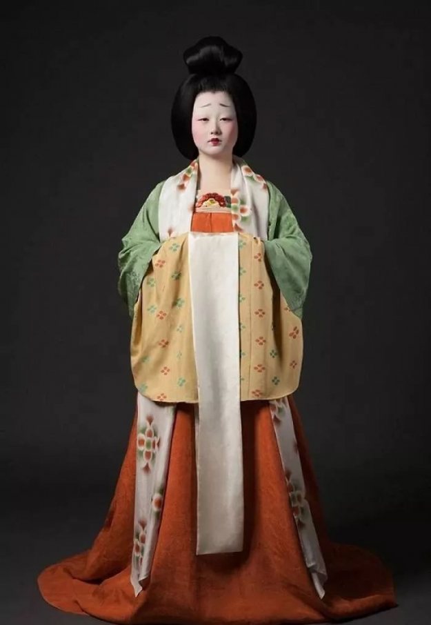 在隋代及初唐时期,妇女的短襦都用小袖,下着紧身长裙,裙腰高系,一般都在腰部以上,有的甚至系在腋下,并以丝带系扎,给人一种俏丽修长的感觉。