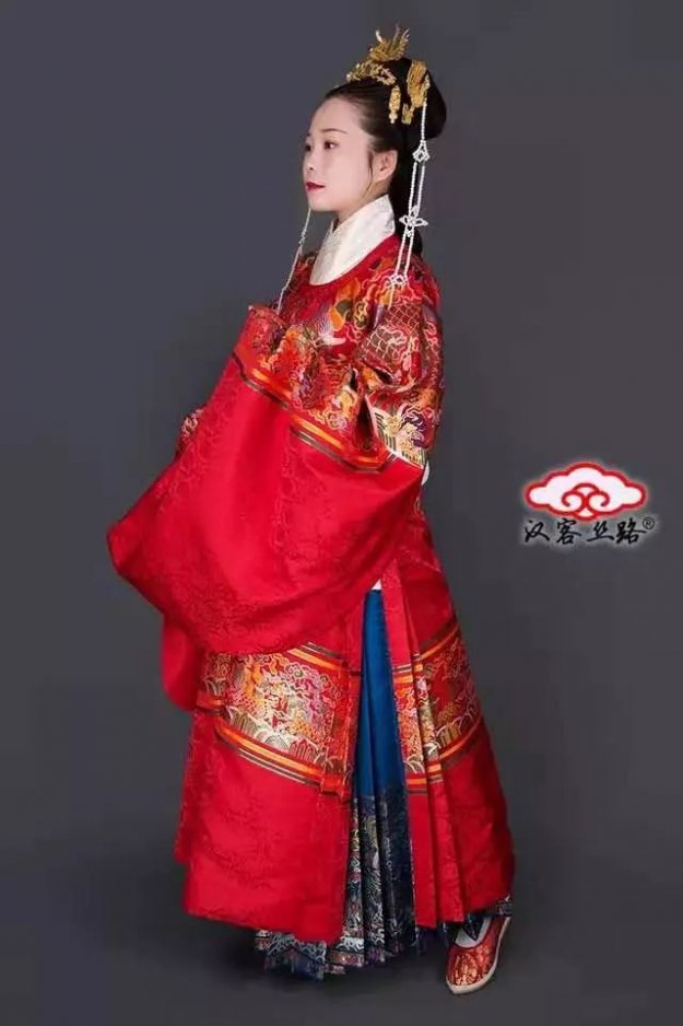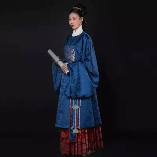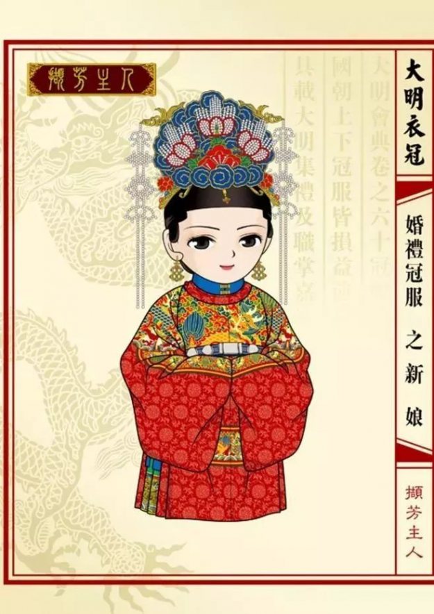 穿搭款式八:婚嫁服作为女性婚嫁服,搭配的服饰有:大衫(罩袍)、圆领袍、褙子/长袄(内袍)、马面裙与玉(革)带。在形制上遵循袄裙特点。明初期时,内穿褙子外罩大衫,明晚期时,流行内穿竖领长袄外罩织绣华丽的圆领袍(通袖袍)