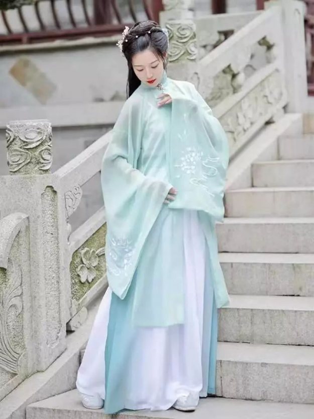 穿搭款式六:大袖衫明立领最早出现于明朝中期,到了明朝后期的 中原和江南已经广泛流行。当时明朝正经历千年不遇的小冰河时期,气候异常寒冷,立领应运而生。明立领的盘扣材质多采用金属或者布制。所以立领对襟大袖衫也是作为明制汉服典型服饰。