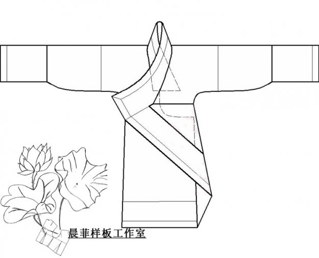 曲裾深衣后片衣襟接长,加长后的衣襟形成三角,经过背后再绕至前襟,然后腰部缚以大带,可遮住三角衽片的末梢。这一状况可能就是古籍资料提到的“续衽钩边”。“衽”是衣襟。“续衽”就是将衣襟接长。“钩边”应该是形容绕襟的样式。