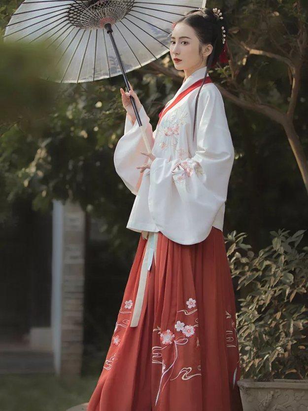 应避免明制立领这种易显肩宽的款式,如果一定要穿的话,上衣外面罩一个比甲或者材质较轻盈的大袖衫会更好!