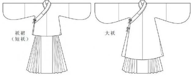 而现在一般认为, 上衣较长并遮住裙腰便为袄裙, 而需要把衣服塞到裙腰内的为襦裙, 但两者都属于襦裙体系。