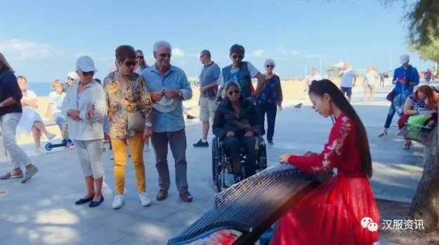 她身穿一袭红色长衫,头戴古钗,在异国他乡的街头,用古筝弹奏了一曲又一曲动人乐章,引得许多法国民众驻足观赏。