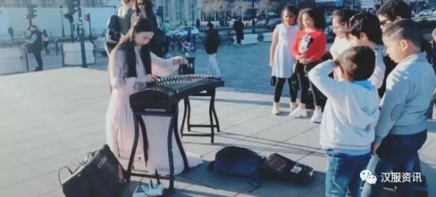 于是这名娇小中国女孩,把古筝搬到了法国的街头,一身汉服,一人一琴,忘情演奏。