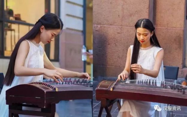 起初只有一些小孩子,后来,越来越多的人走到了她的身边,到最后,古筝声音响起,街上的人无不驻足围观。