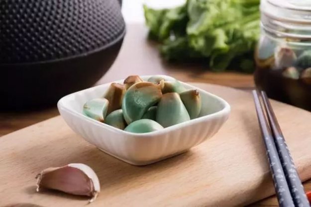 将蒜瓣去老皮,浸入米醋中,
