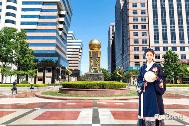 熙熙攘攘的金融街街头忽然簇拥出步履轻盈的都市少女:办公室正装摇身一变汉服,自信端庄的身姿轻快自如地穿梭过繁华街道,前往金融街广场金球地标打卡,叮~~
