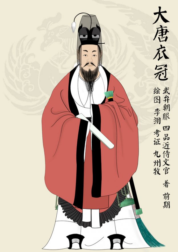 举《唐六典》为例:“凡百官朝服,陪祭、朝会,大事则服之。冠,帻,缨,簪导,绛纱单衣,白纱中单,皂领、标、襈、裾,白裙、襦,革带、钩暐,假带,曲领,方心,绛纱蔽膝,袜,舄,剑,双佩,双绶。六品已下去剑、佩、绶。”又“武弁、平巾帻,文武官及中书、门下、殿中、内侍省,诸卫及太子诸坊、诸率府,及镇、戍流内九品已上服之。侍中、中书令、散骑常侍加貂蝉。”