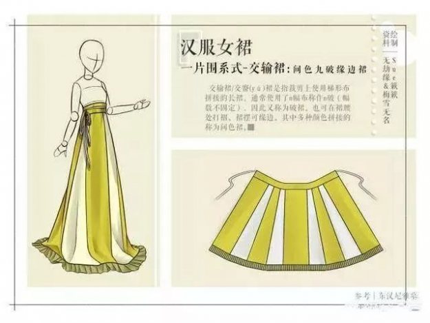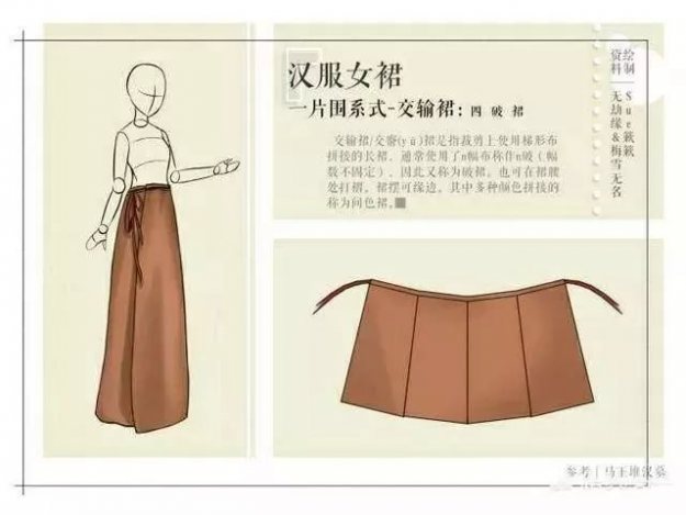 交窬裙俗称破裙,又叫交输裙。它是由多块布料裁片缝合而成的,裁片均为梯形状,有出土过直角梯形残片。