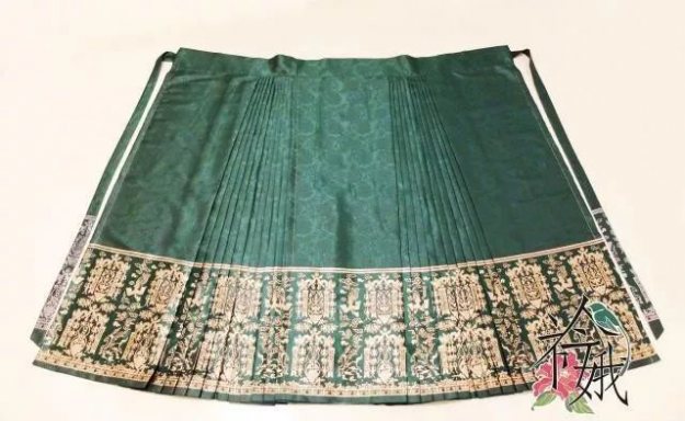 马面裙的突出特征除了裙门多之外,还有着整齐锋利的对褶,除前后裙门平整光洁不需要打褶外,其余诸处都打褶,一般为三四对对褶,裙腰左右两端缝缀系带,马面裙裙摆宽大,在膝盖部位及下摆部分会织绣寓意吉祥的美丽纹样,即膝襕和底襕。