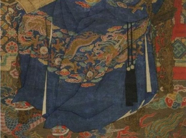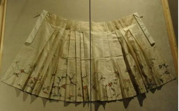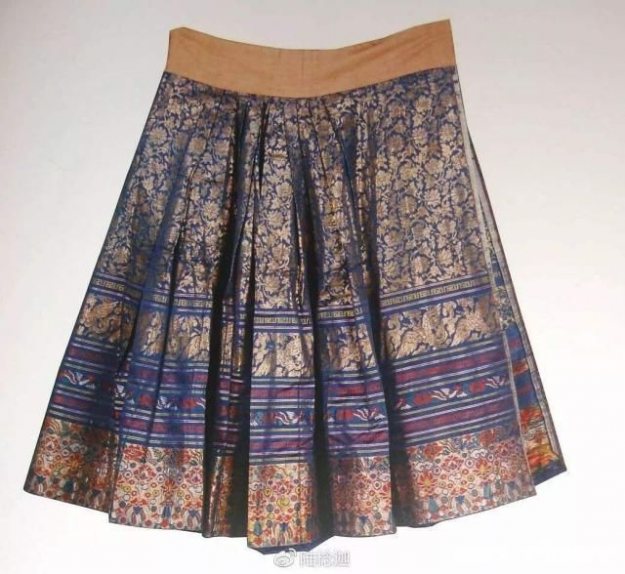 下面这张图片上的马面裙是孔府珍藏的妆花织金蓝缎裙,虽然过去了几百年,这条满地金马面裙依旧闪闪发光,美不胜收。窄膝襕宽底襕的样式搭配、褚黄色裙腰绝对是当年最流行的裙子之一!