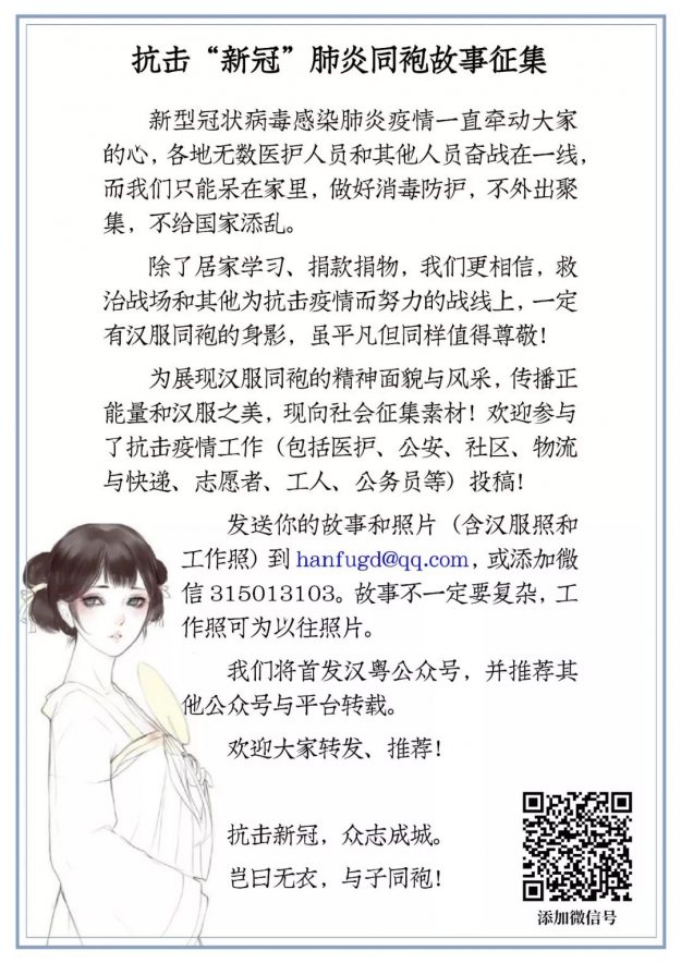 发送你的故事和照片(含汉服照和工作照)到hanfugd@qq.com,或添加微信315013103。故事不一定要复杂,工作照可为以往照片。