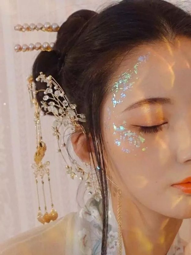 最后再画上花钿,戴上长发片,插上簪子,一套完整的汉服妆容就完成啦。