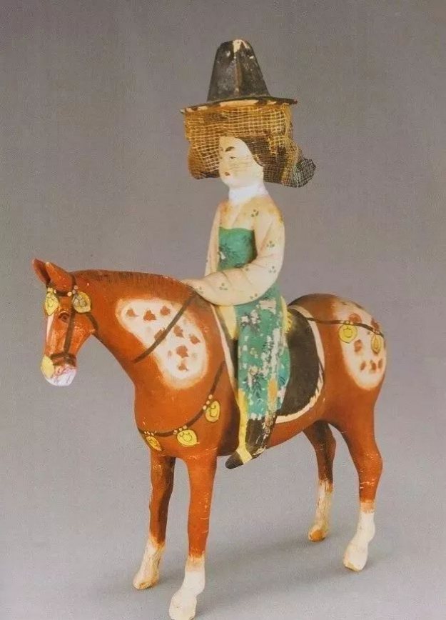 “唐代彩绘骑马戴帷帽仕女俑”复制而成,